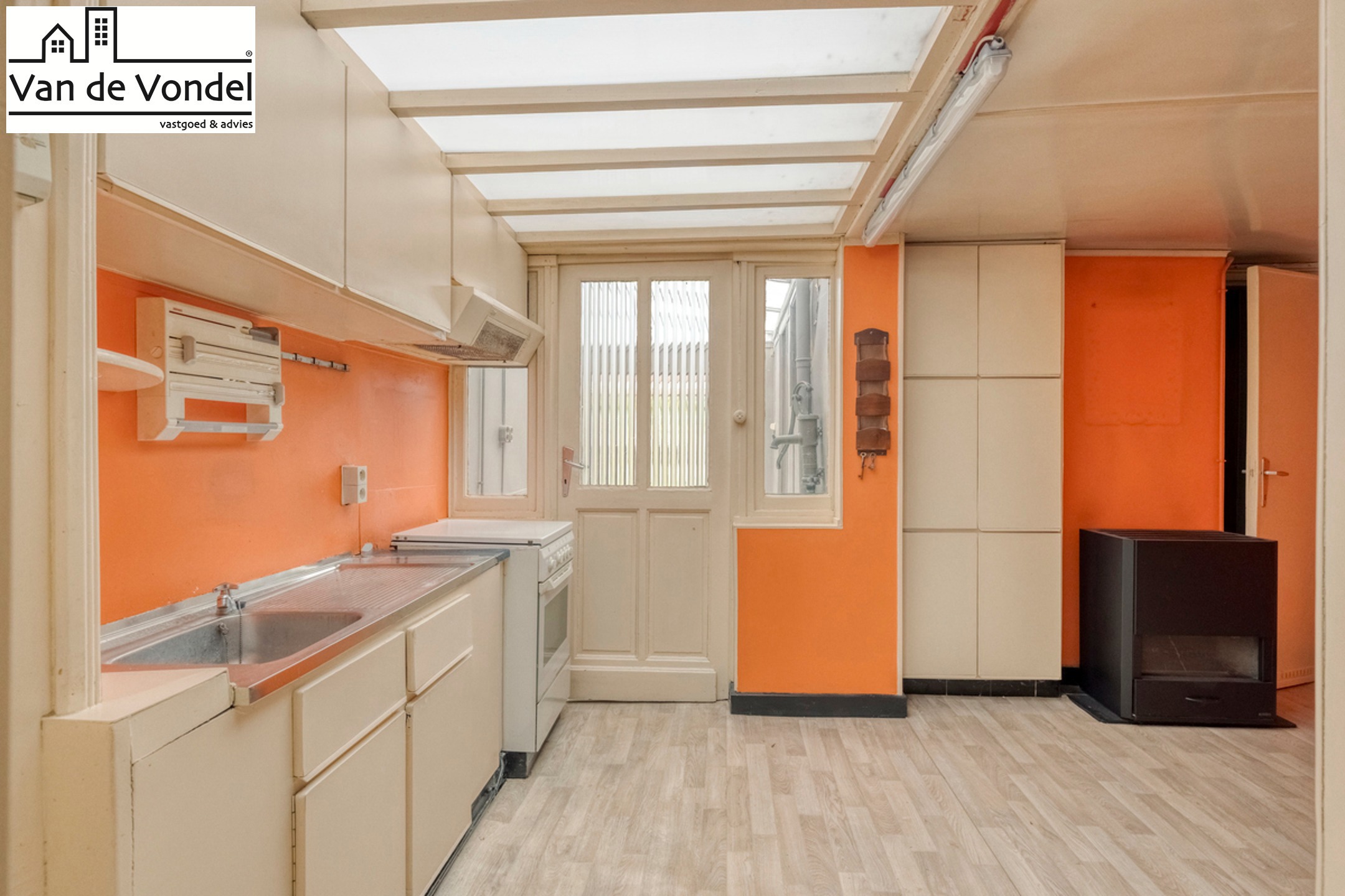 Bij het binnenkomen word je verwelkomd in de inkomhal, die leidt naar de gezellige leefruimte met aanpalende keuken. De ingerichte badkamer bevindt zich op het gelijkvloers, samen met een veranda voorzien van toilet en handige opbergruimte. De zonnige tuin achteraan is een fijne plek om te ontspannen en te genieten van buitenlucht.